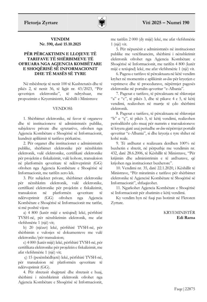 Është botuar në Fletoren Zyrtare Nr.190 të vitit 2025 VKM nr.590 datë 15.10.2025 “Për përcaktimin e llojeve të tarifave të shërbimeve të ofruara nga Agjencia Kombëtare e Shoqërisë së Informacionit dhe të masës së tyre”.